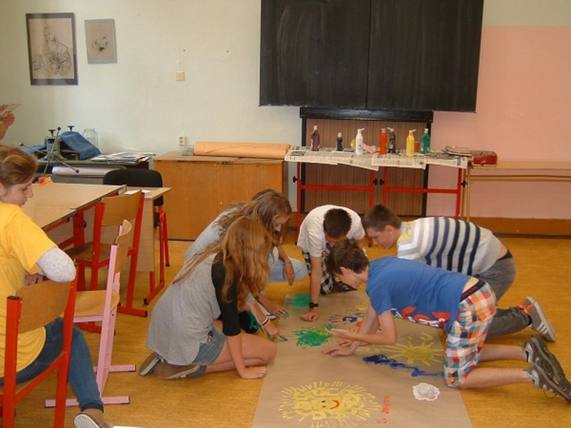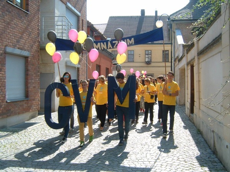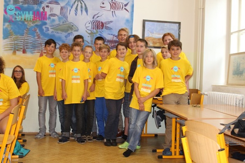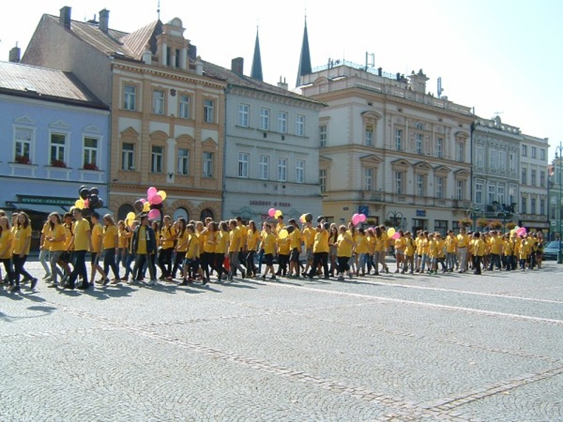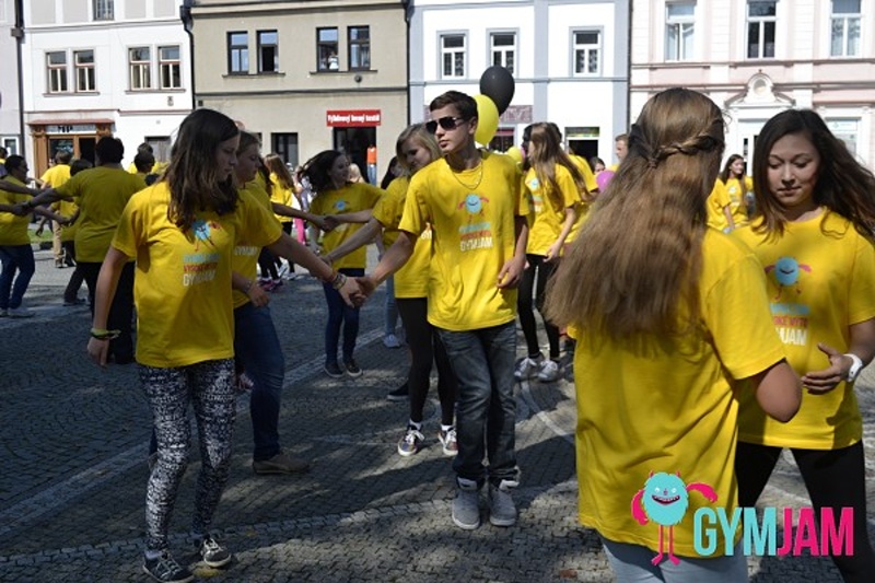 This year, the beginning of the academic year was a very special one for the students of Gymnázium Vysoké Mýto since on Thursday 4th September they organized a special event for the pupils of other local schools as well as the inhabitants of the town. It was the first time but maybe the start of a new tradition. After a long discussion among the students the event was called GymJam. The programme was really rich – in the morning the whole school building was open house with various workshops and competitions nearly in each of the classrooms, e.g. creating fabric flowers, learning the cup song activity, doing jigsaw puzzles and guessing the secret letter or learning to dance “a Belgian dance”. After lunch all the students of the school wearing bright yellow T-shirts gathered in front of the school building and marched together onto the main square where they formed three huge circles and performed the Belgian dance to the amusement of crowds of by-passing spectators. Then the parade continued and led to the local small open-air theatre where the afternoon cultural programme started. Quite a lot of our students play in a music band and so the show was made of their performances. In the evening there was a theatre performance of professional theatre company called Drak (Dragon in English) from Hradec Králové. It was a very busy and amusing day for all the students and other participants, really something to remember.